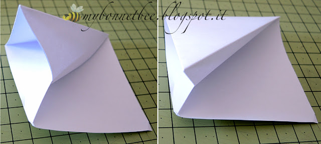 Per realizzarlo ho scelto un modello origami che lascia la base triangolare intera, non separata in due metà. Il foglio di partenza è un quadrato di circa 18 cm. Vi ho preparato uno schemino e un paio di foto per l'ultimo passaggio, il più antipatico.